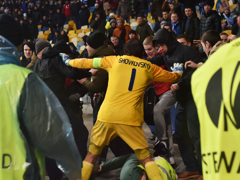 Le gardien ukrainien, Oleksandr Shovkovskyi, tente de calmer les agresseurs
