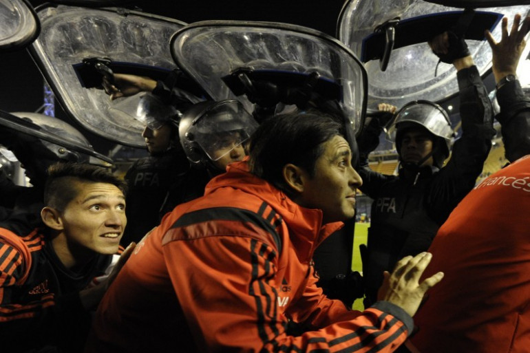 La sortie des joueurs de River Plate protégée par les forces de l'ordre, le 15 mai 2015