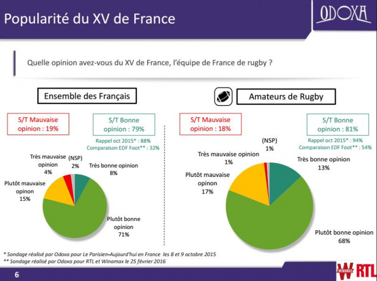 Mais les Français sont nettement plus indulgents avec leurs joueurs. 79% d’entre eux et 81% des amateurs de rugby ont une bonne opinion du XV de France. C’est évidemment un score extrêmement élevé. Il l’est d’autant plus si l’on ose la comparaison avec leurs homologues footballeurs qui pointaient fin février sur notre Baromètre Sport à un médiocre niveau de 32% de popularité chez les Français et de 54% chez les amateurs de football. Les mauvais résultats n’ont certes pas rendu le XV de France impopulaire mais il ne faudrait pas enchaîner les contre-performances trop longtemps. En l’espace de 4 mois, la popularité des Tricolores a fondu de 9 points chez les Français et de 13 points chez les amateurs de rugby. Un autre élément nuance la popularité de l’équipe de France de Rugby : sur les 79% de Français affirmant en avoir une bonne opinion, seulement 8% la déclarent très bonne.