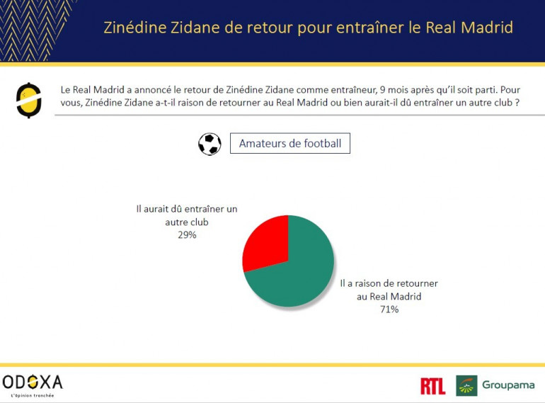 Les amateurs auraient pu considérer qu’après avoir tout gagné à Madrid, Zidane aurait pu choisir de diriger un autre club. Il n’en n’est rien, 71% d’entre eux estiment qu’il a raison, 29% seulement considérant qu’il a tort.