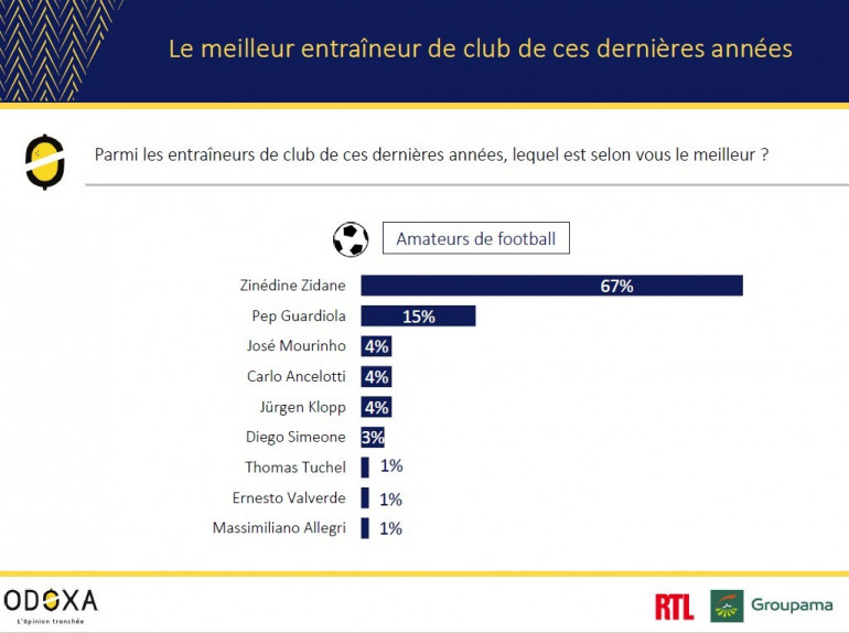 Deux autres Ligue des champions plus tard, les amateurs de football n’ont plus aucun doute : Zidane est de très loin le meilleur entraîneur de club du moment.Les deux tiers (67%) d’entre eux le désignent. Il devance très largement la concurrence, pourtant constituée de très grands noms.