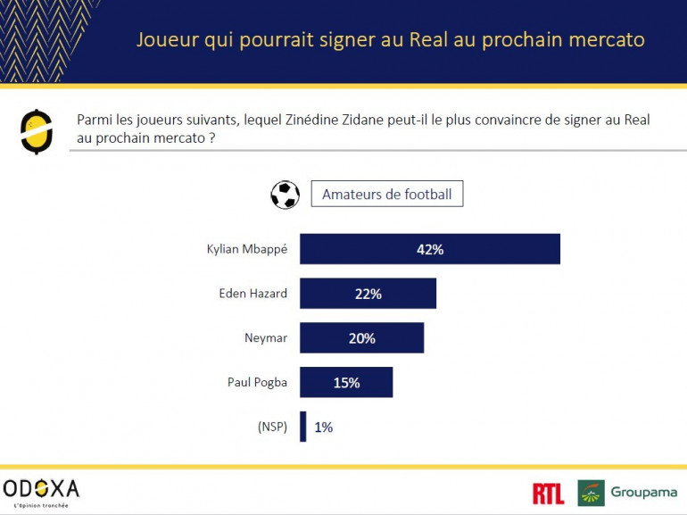 71% des passionnés estiment qu'il a raison de retourner au Real Madrid, contre 29% qui pensent qu'il aurait dû relever un autre challenge. Entre Kylian Mbappé, Eden Hazard, Neymar et Paul Pogba, c'est le premier qu'il a le plus de chances de convaincre de signer l'été prochain.