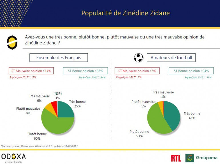85% des Françaises et des Français, et 94% des amateurs et amatrices de football ont une bonne opinion de Zinédine Zidane. Le Français de 46 ans est considéré comme le meilleur entraîneur de club au monde par 67% des sondés.