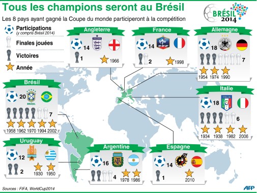 Infographie : les 8 pays ayant gagné la Coupe du monde de football, présents au Brésil en 2014