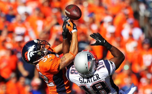 Tony Carter des Denver Broncos à la lutte avec Matthew Slater des New England Patriots