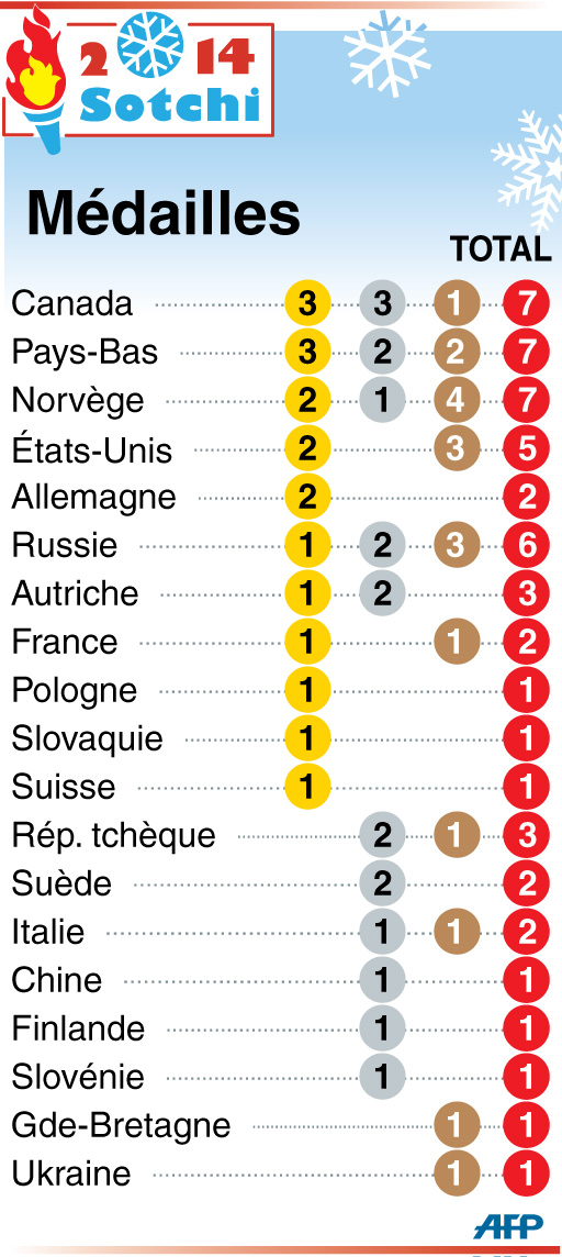 La journée de lundi a aussi été marquée par les médailles canadiennes. En patinage de vitesse, sur piste courte, Charles Hamelin devance le Chinois Tianyu Han et le Russe Victor An. Mais le coup d'éclat des voisins d’outre-atlantique est venu des bosses. Déjà détenteur d'un doublé chez les dames, le Canada a décroché l'or chez les hommes, grâce à Alexandre Bilodeau, qui devance son compatriote Mikael Kingsbury et le Russe Alexandr Smishlyaev.
