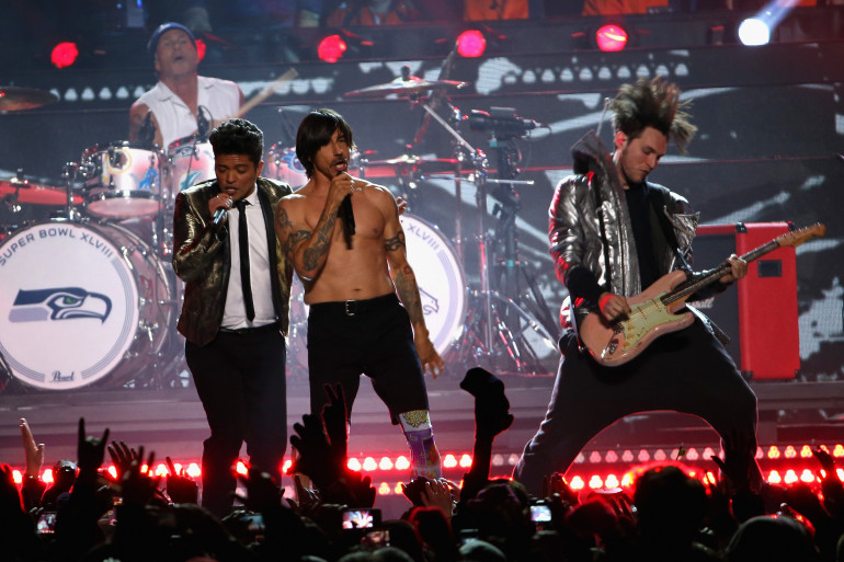 Bruno Mars partage la scène avec les Red Hot Chili Peppers pour le spectacle de la mi-temps du Super Bowl 2014.