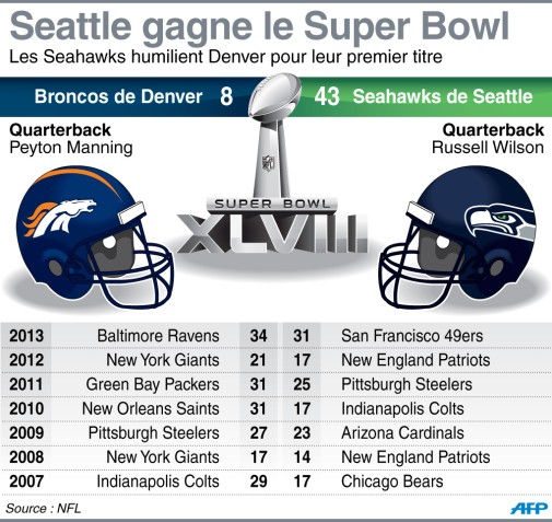 Seattle n'avait atteint la finale de la NFL qu'une seule fois auparavant, défait par Pittsburgh en 2006. Denver a de son côté perdu son cinquième Super Bowl, pour deux victoires en 1998 et 1999. La meilleure attaque de la saison s'est montrée très nerveuse et a été complètement étouffée. Son quarterback vedette Peyton Manning, qui avait remporté samedi le titre de meilleur joueur de la saison (MVP), n'a pas pu faire la différence dans ce match au sommet malgré 34 passes complétées, un record pour un Super Bowl. Mais il a réussi la plupart de ses passes alors que le match était déjà plié et les deux interceptions qu'il a subies ont coûté cher.