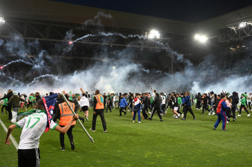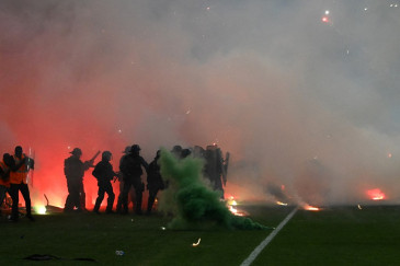 Après le tir au but reléguant Saint-Etienne en Ligue 2, des centaines de supporters sont entrés sur le terrain, et ont lancé des fumigènes en direction de la tribune présidentielle et des joueurs.
