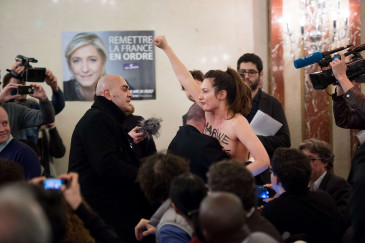 Deux Femen ont manifesté devant la mairie d'Oyonnax dans l'Ain qui faisait office de bureau de vote, pour réclamer la "démission" du ministre des Solidarités Damien Abad, mis en cause pour des violences sexuelles.