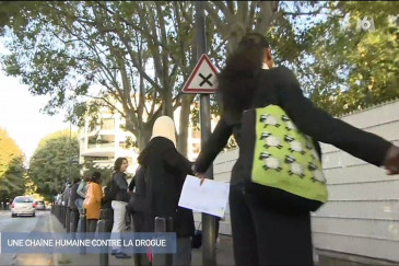 Afin de protéger leurs enfants et de lutter symboliquement contre le trafic de drogue qui se déroule autour de l'école maternelle de l'Hermitage à Saint-Denis, des parents se tiennent la main et forment une chaîne humaine.